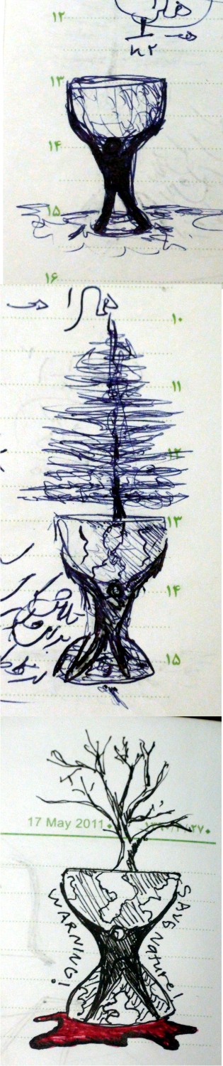 اون نماد یک انسانه که دیدش به طبیعت فقط در جهت منافع سرمایه داری خودشه و داره طبیعت رو به نابودی میکشه. خود نصفه های کره زمین مانند یک ساعت شنیه که اشاره به گذر زمان و ادامه تخریب طبیعت داره و در عین حال این خطای اون شخص وزنی روی سر خودش هم شده که باید تحمل کنه