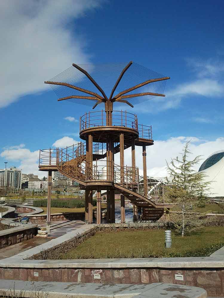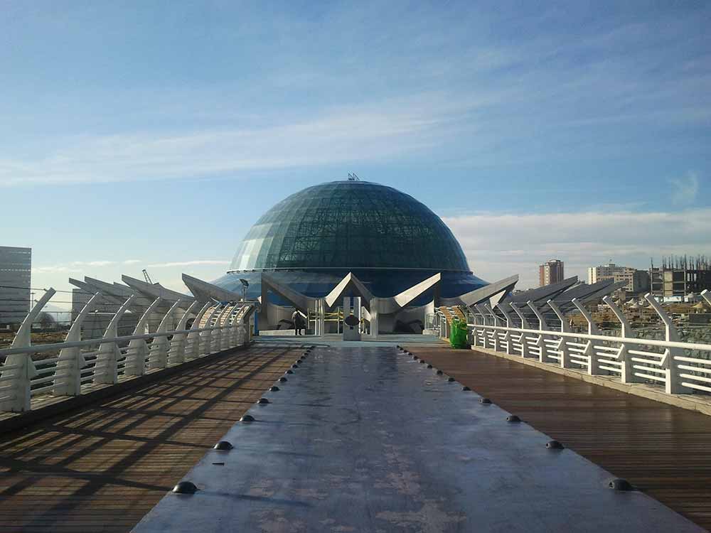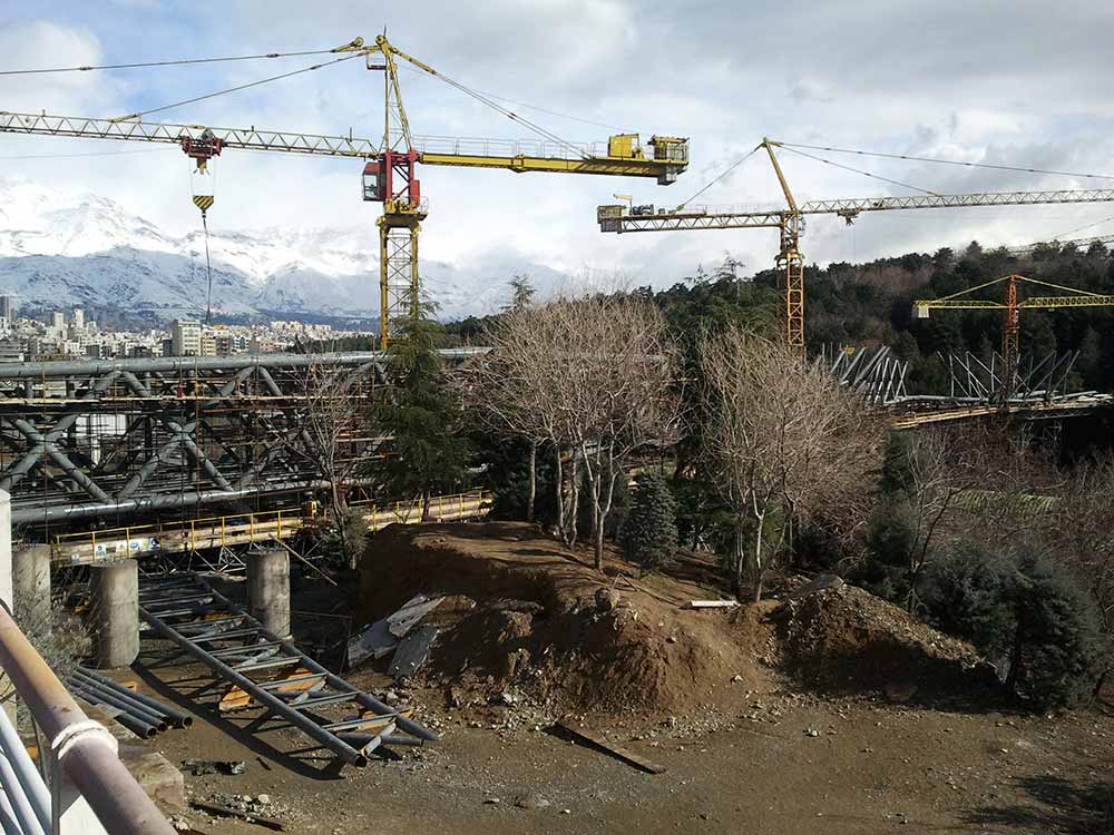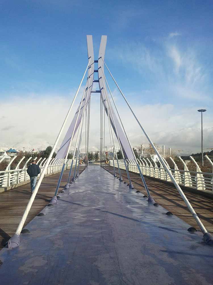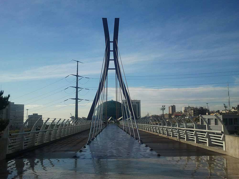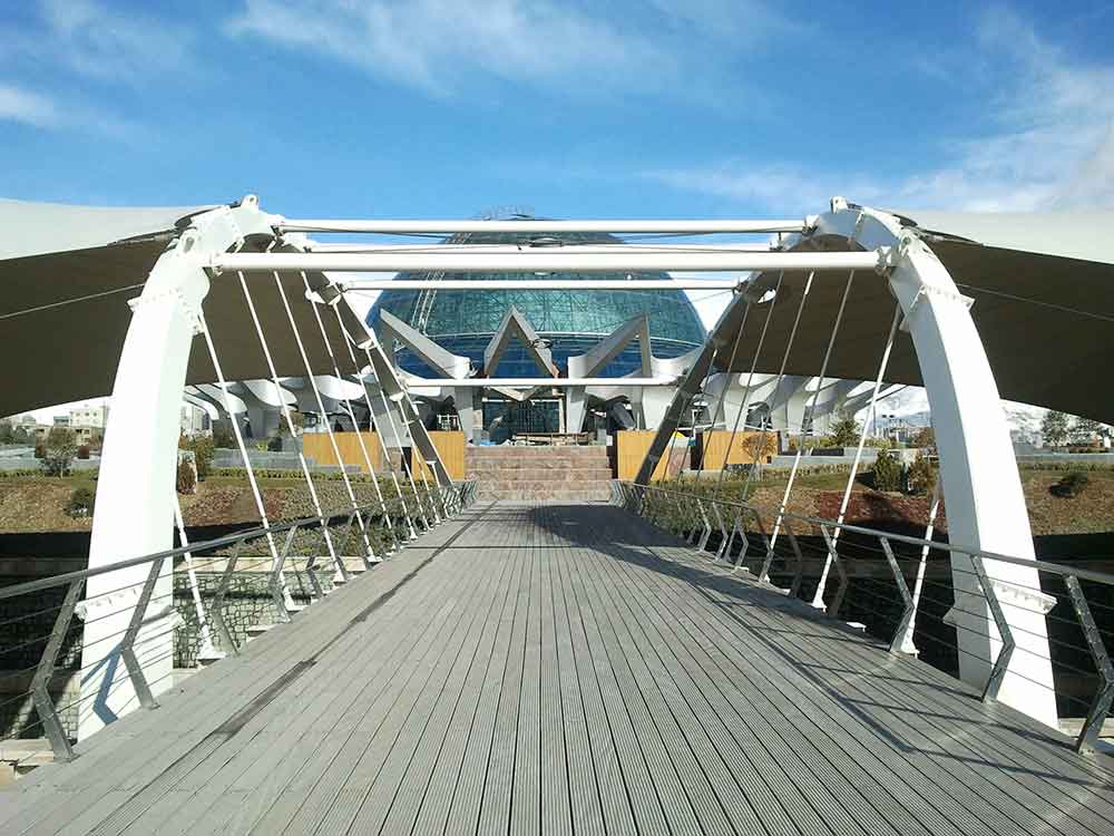 بر میگردیم به سمت جنوب و بوستان بنادر را رد میکنیم میرسیم به اتوبان، خب چاره چیه؟ پل ابریشم! اولین پل عابر پیاده به معنای حقیقی، این پل بوستان بنادر رو به مجموعه جنوبی متصل میکنه. در عکس زیر پلانتاریوم (آسمان نما) هم دیده می شود که هنوز افتتاح نشده:
