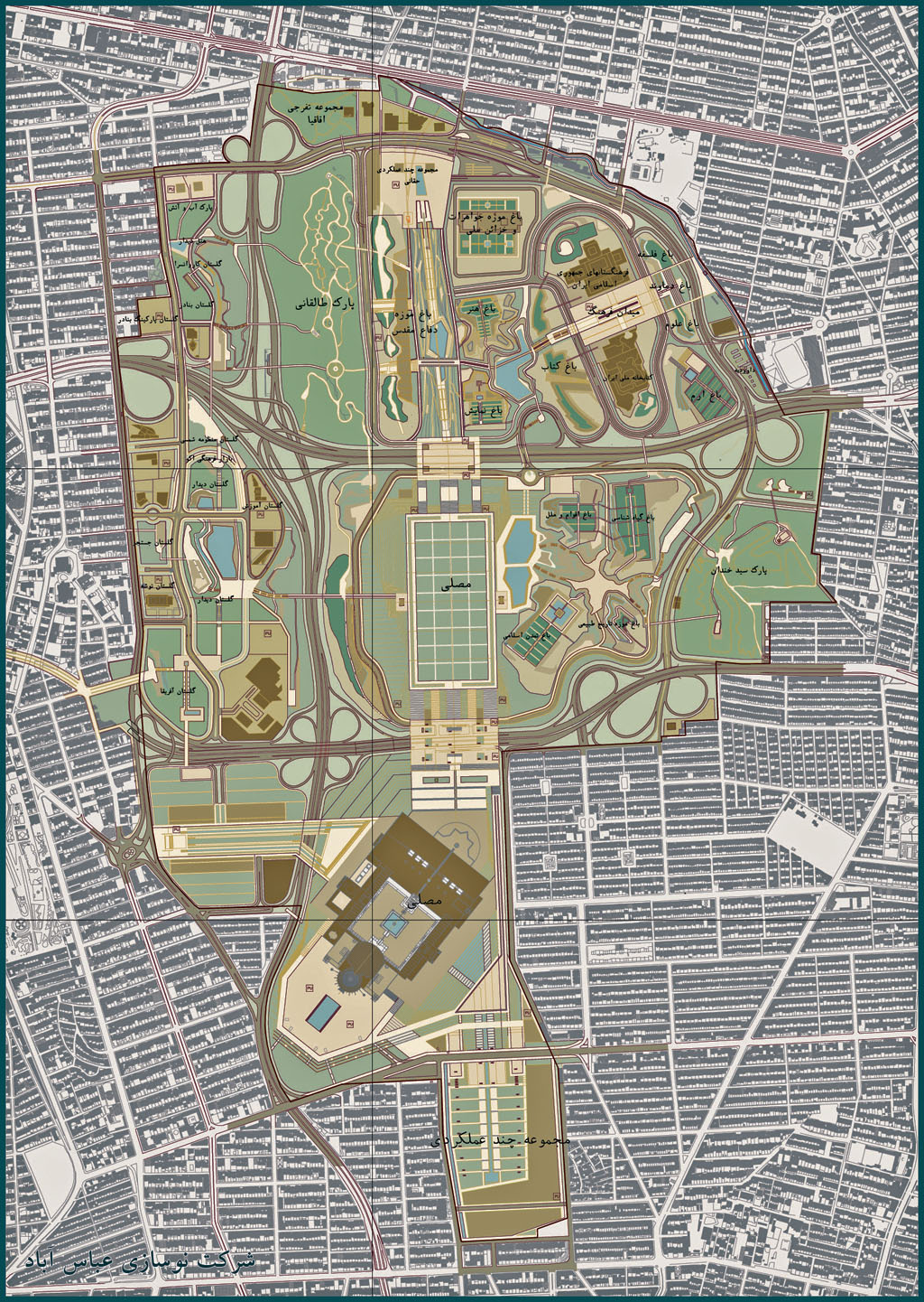این پروژه شامل چندین فضا بر حسب کاربرد های فرهنگی، تفریحی و ... است. از طرفی در ضلع جنوبی مصلی بزرگ تهران قرار دارد. ضلع غربی این مجموعه پارک جنگلی میرداماد و باغ موزه دفاع مقدس و همچنین شامل انواع بوستان ها و فضا های سبز است. ضلع شرقی بیشتر فضا های فرهنگی نظیر باغ های کتاب، هنر، نمایش، تمدن اسلامی و کتاب خانه ملی و فرهنگستان جمهوری اسلامی ایران است. با توجه به نقشه زیر فضا ها رو مشخص کردم. عکس هایی که گذاشتم فقط مربوط به بخشی از این پروژست که دورش خط کشیدم چون هنوز اتصال بین بخش شرقی و غربی مجموعه برقرار نشده بود که پیاده بتونیم بریم سمت شرقیش. در ادامه هم نوع اتصال رو نشون میدم. زیاد توضیح نمی خوام بدم، هدف اصلیم عکس ها و فضا و چشم انداز زیبای مجموعه است.